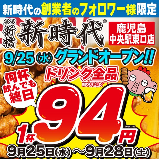 「新時代 鹿児島中央駅東口店」のオープンを記念し、ドリンク全品94円(税込103円)キャンペーンを開催します。
