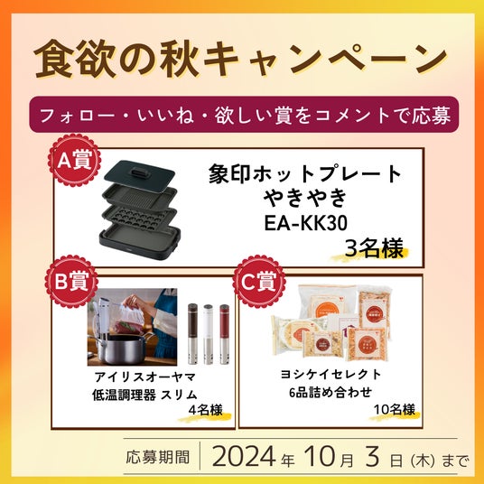 メニューブック「すまいるごはん」では9/9号から10/14号の6週間にわたり今年で4度目となる「ヨシケイ 秋のミールキット祭り2024」を開催。食欲の秋にピッタリ、人気のお店や企業とのコラボメニューや抽選で賞品が当たるプレゼントキャンペーンなど楽しい企画を展開します。
