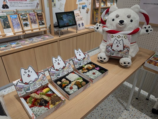 飛び出す「しっぺい」と、磐田市内の名所をデザインしたパッケージ(お弁当箱)
