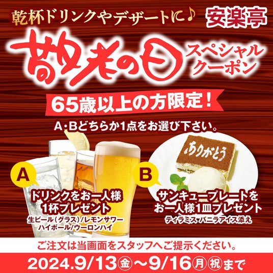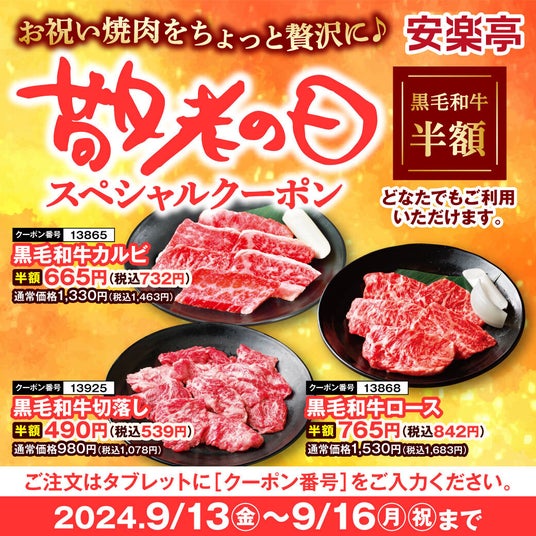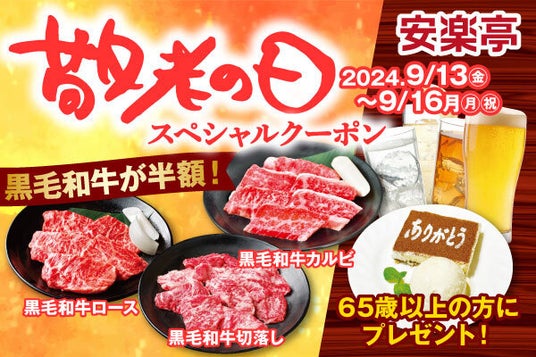 9月16日は敬老の日。安楽亭では「敬老の日」のお祝い焼肉をおトクに、ちょっと贅沢におたのしみいただきたいという想いから9月13日(金)~9月16日(月・祝)の期間、敬老の日スペシャルクーポンを配信します。