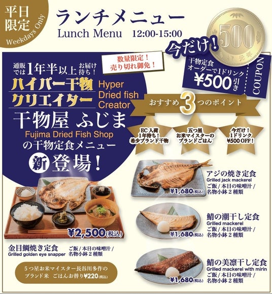 3.期間限定で干物定食オーダーで1ドリンク、500円割引を実施いたします。