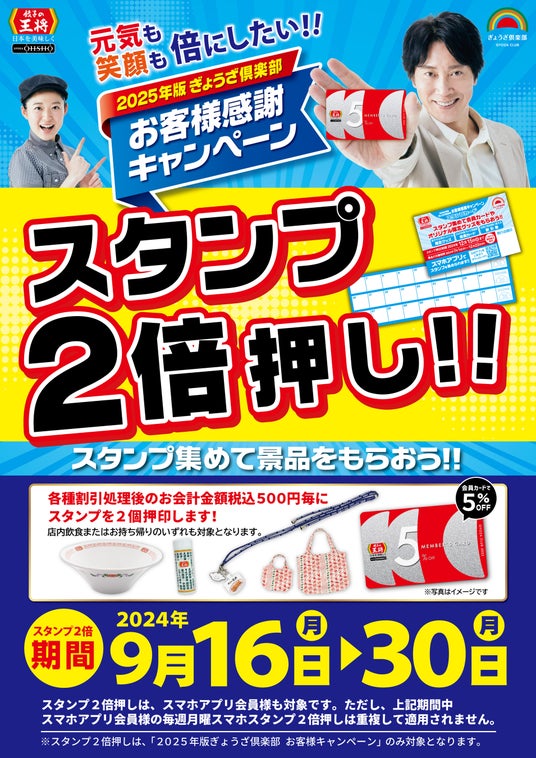現在開催中の『2025年版 ぎょうざ倶楽部 お客様感謝キャンペーン』において、通常、各種割引処理後のお会計金額税込500円毎にスタンプを1個押印するところ、2倍の2個押印いたします。