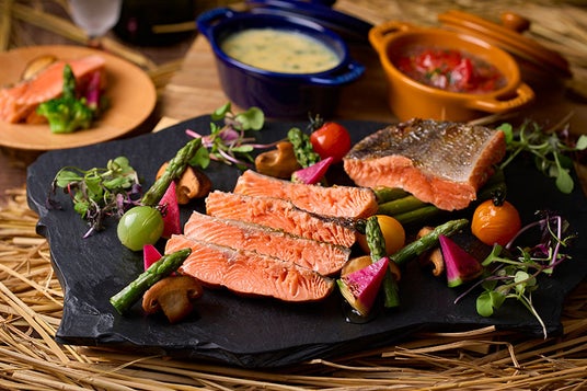左:ライブキッチンで焼き上げる「みやぎサーモンの藁焼き」は香ばしい藁の香りが食欲をそそります。