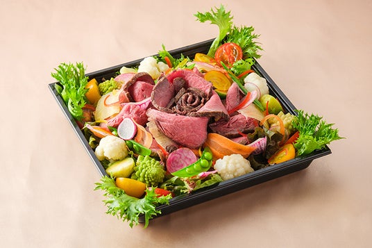 『和牛モモ肉のローストビーフ ローズサラダ仕立て 山葵風味の和風ドレッシング』 (50個限定)しっとりと濃厚なホテル特製ローストビーフと18種類の新鮮な野菜をローズサラダに仕立てた豪華な逸品。オードブルにも、メインディッシュにもおすすめです。