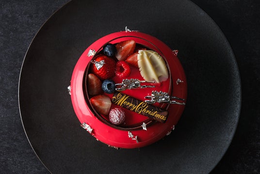 『マリー ルージュ2024』赤い果実をテーマにしたラグジュアリーなムースケーキ。赤桃のムースと苺のジュレを、フランボワーズのムースで包んだ果実感たっぷりな味わい。洗練されたヨーロピアンスタイルで、クリスマスを華やかに演出します。