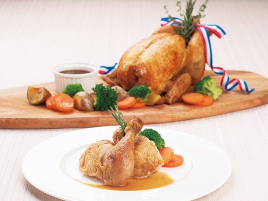 『国産鶏のローストチキン 3種の野菜添え』 (30個限定)クリスマス定番のメニュー。きめが細かく柔らかい国産鶏をふっくらジューシーに仕上げました。