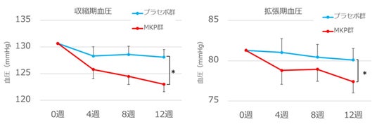 内容:対象者をランダムに2群に分け、プラセボまたはトリペプチドMKP(R)(100 μg/日)を含む食品のいずれかを摂取していただき、4週間おきに血圧(収縮期血圧、拡張期血圧)を測定しました。