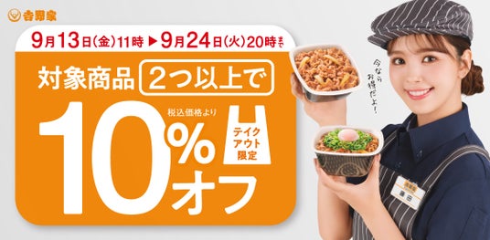 株式会社吉野家(本社:東京都中央区、代表取締役社長:河村泰貴、以下吉野家)は、9月13日(金)11時から9月24日(火)20時までの期間、全国の吉野家店舗(※1)でテイクアウトにて対象商品を2つ以上購入するとお会計時に対象商品の金額を税込価格より10%オフするキャンペーン(※2)を実施します。
