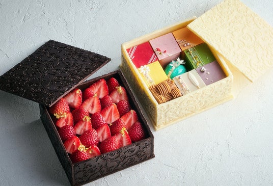 BLACK BOXには、イチゴを贅沢に二段に重ねたストロベリータルト。WHITE BOXには宝石箱をイメージし、虹色の鮮やかなプティガトーを9種類詰めました。