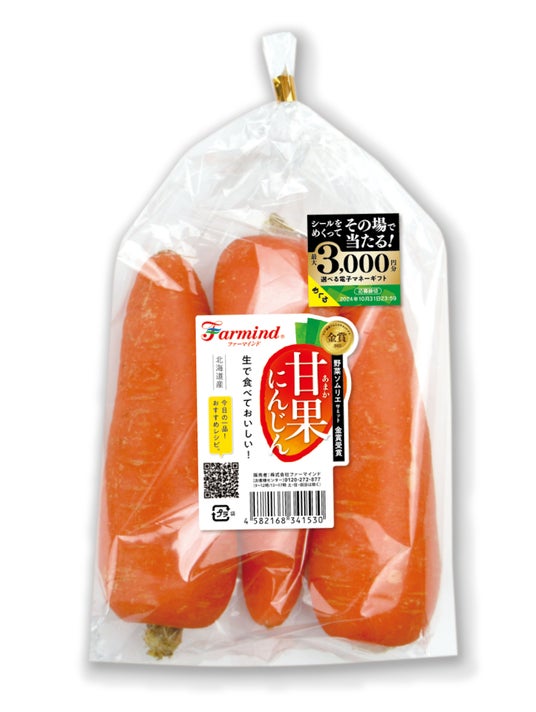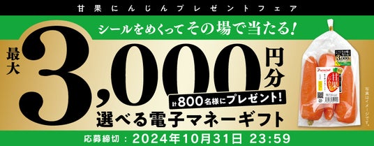 青果の総合流通企業の株式会社ファーマインド(本社:東京都千代田区、代表取締役社長:堀内達生)は、2024年9月13日(金)より、選べる電子マネーギフトが当たる『その場で当たりが分かる 甘果にんじん秋キャンペーン』を実施いたします。