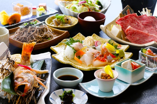 日本海の秋のおすすめ食材「のどぐろ」の塩焼きやお造里、全国でも高評価の肉質を誇る「鳥取和牛」と鳥取産キノコのすき焼き鍋など、鳥取自慢の食材を使用した贅沢料理です