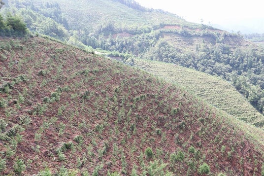 ▲植栽した斜面。傾斜があり機械化が難しい。