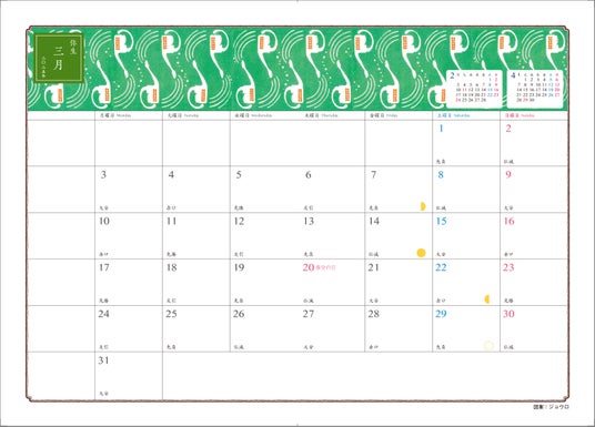 京都の木版印刷技術を130年以上伝承する竹中木版「竹笹堂」の原田裕子氏が、表紙と月間カレンダーの木版画制作を手掛け、和のモチーフを取り入れたデザインからは、京の風情を感じることができます。