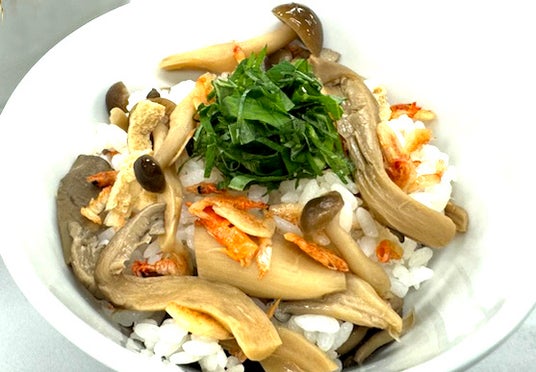 さまざまな種類のきのこを入れ、米の一粒一粒にきのこの旨味がしっかりと染み込んでいます。炊きたての湯気とともに、きのこの芳醇な香りが立ち上り、食欲をそそります。