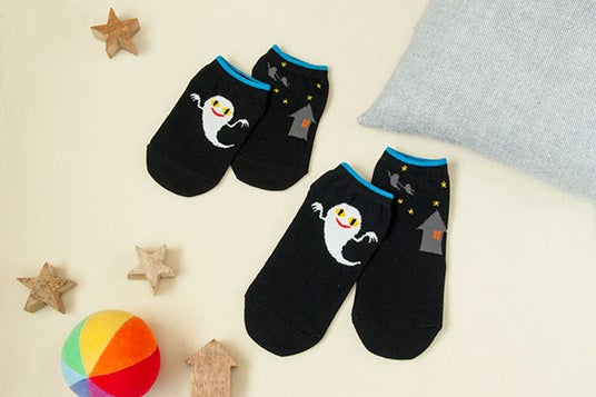 左側はおばけ、右側は裏表紙の絵柄が編みこまれていて、左右柄違いがオシャレ。絵本の背表紙と同じ青色のフチが、足元をきゅっと華やかに見せてくれます。