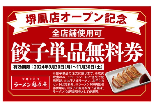 さらに!オープンを記念して、「堺鳳店」にご来店いただいたお客様には全店舗※でご使用いただける餃子単品無料券を配布いたします。