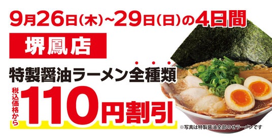 この度オープンを記念して、「堺鳳店」にご来店いただいたお客様には、『特製醤油ラーメン全種類』を税込価格から110円割引で販売いたします。