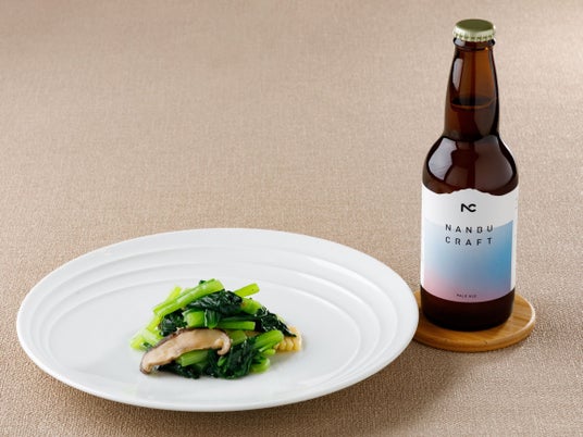 *大蒜を効かせた青菜炒めがビールの華やかな香りによく合う。