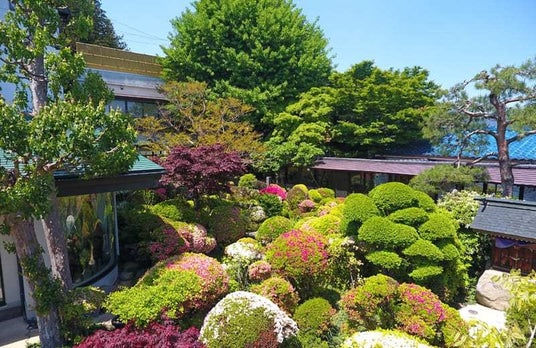 「三宜亭本館」は、長野県の飯田城跡に位置し、客室や大浴場からは南アルプスの山並みや飯田市街の風景を眺めることができる温泉旅館です。