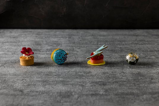 プレミアムトークセッションでは、アーティストの作品を表現したパティシエからのコラボレーションスイーツをご用意。舘鼻氏の作品「CAMELLIA FIELDS」や桑田氏の技法「梅華皮」などをタルトやトリュフチョコレートなどで表現しました。窓一面に広がる絵画のような景色と共に、五感でアーティストの作品をお楽しみいただけます。
