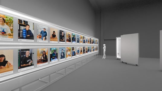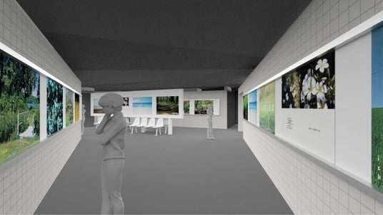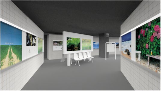 フロアのデザインは、駅のホームにある広告掲出看板やベンチ、タイルの壁など、駅らしさをイメージして作られており、これまでの40年で制作してきた作品の中から厳選した40枚の駅貼りポスターが目に飛び込んできます。