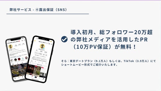 弊社運営メディアは東京の店舗集客と非常に相性が良く、来店数アップにつながると大変好評を頂いております。instagram、TikTokなどのSNSによるPRに加え、自社アプリでも優先表示。10万PVに達するまでPRを行います。