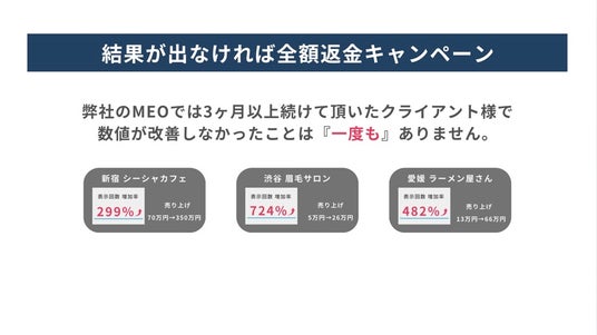 9月ご契約の店舗様に限り、3ヶ月で全体表示回数が上がらなければ全額返金するキャンペーンを行います。