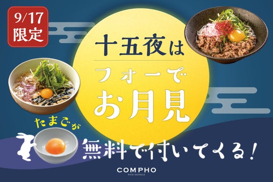 シマダハウス株式会社(東京都渋谷区、代表:島田成年)が運営するCOMPHO(コムフォー)は各店舗で2024年9月17日(火)に『十五夜はフォーでお月見』として無料で生卵のトッピングを提供いたします。お月見のイベントを通じて、米麺と生卵の織りなす味わいをお楽しみください。