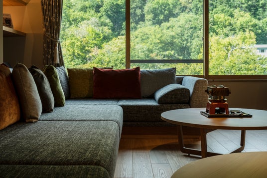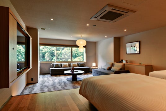 窓際には2台のロングソファを配置。シモンズ社製のダブルベッドと選べる3つの枕が、上質な眠りへ誘います。当館オリジナルのエッセンシャルオイルが香る客室で、特別な癒しの時をお過ごしください。