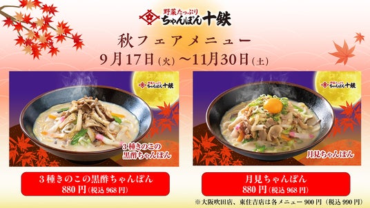 創業50年以上の「長崎ちゃんめん」の姉妹店として西日本を中心に展開しています「長崎ちゃんぽん十鉄」では9月17日(火)より旬な秋の食材を使用しました期間限定メニュー2種類を販売いたします。「3種きのこの黒酢ちゃんぽん」と「月見ちゃんぽん」。美味しさと彩り鮮やかな秋の風味をお楽しみください。皆さまのご来店をスタッフ一同お待ちしております。