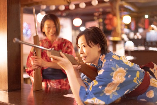 昭和レトロな横丁で、射的やスマートボール、ヨーヨー釣りなどの縁日遊び、伊豆焼酎やラムネ、綿菓子など、昭和の世界感が気軽に楽しめます。夕方の湯上りのビール1杯(16:00~17:20)、つるや自家製甘酒の無料サービスも好評です。