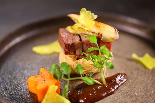 強肴は、富良野産牛ロースの柚子味噌焼きを赤ワインのカシスソースでご用意しました。土の中から生えている秋のキノコを表現しています。牛肉は58℃で8時間以上低温調理をかけて、非常に柔らかく仕上げ、和と洋の味わいをお楽しみいただける一品でございます。
