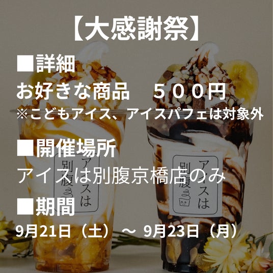 姫路発の夜パフェ専門店「アイスは別腹京橋店」が、夏の感謝をお伝えする「2024年最後の夏の感謝祭」を9月21日(土)~9月23日(月)の3日間で開催いたします。