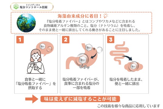 当社はコンブやワカメなどのぬめり成分である食物繊維「塩分吸着ファイバー(アルギン酸類)」が塩分の吸収を抑制するという機能に注目し、大学との共同研究を行いました。