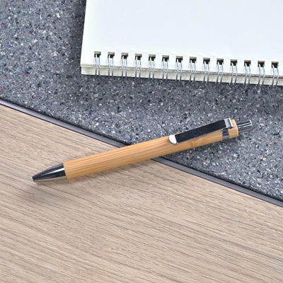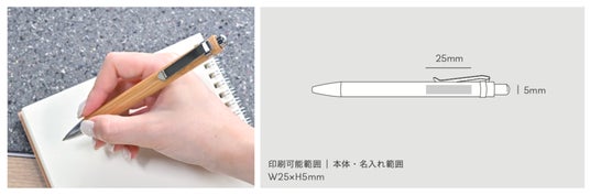 天然の竹を持ち手部分に使用した、プラスチック使用量の削減に貢献するエコなボールペン。自然由来の素材感がおしゃれで手触りが良いのが特徴です。25mm程度のクリップがついており、書類やシャツのポケットからの落下を防ぎます。本体には横25×縦5mmで名入れも可能なため、客室備品としてはもちろん開業記念品やキャンペーンのノベルティとしても展開いただけます。