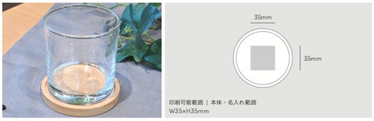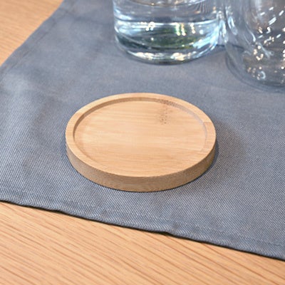 天然竹からできたコースター。直径84mmで厚手な仕様のため、設置面が濡れず使い勝手が良いです。周りには縁もついているため、コップの転倒防止に役立ちます。さらに竹は抗菌性、脱臭性に優れる素材。同じく新製品の竹製コップの蓋としてもフィットするため、合わせてお使いいただくことで備品を上質な雰囲気に統一できます。こちらも横35×縦35mmで名入れが可能です。