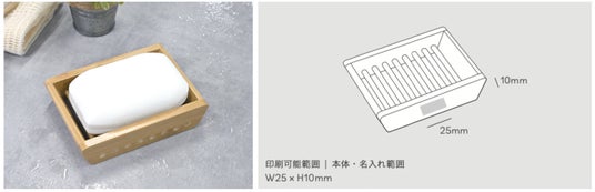 天然の竹を使用した深さ25mmサイズのソープトレイ。通気性がよく、設置面を汚さないように水切りデザインを採用しました。横幅90mmと一般的なバスタイプの石鹸がぴったり入るサイズです。客室の洗面所に導入することで、個性を出しづらい水回りを上質な空間へ演出できます。側面には、横25mm×縦10mmでオリジナルデザインも挿入可能です。