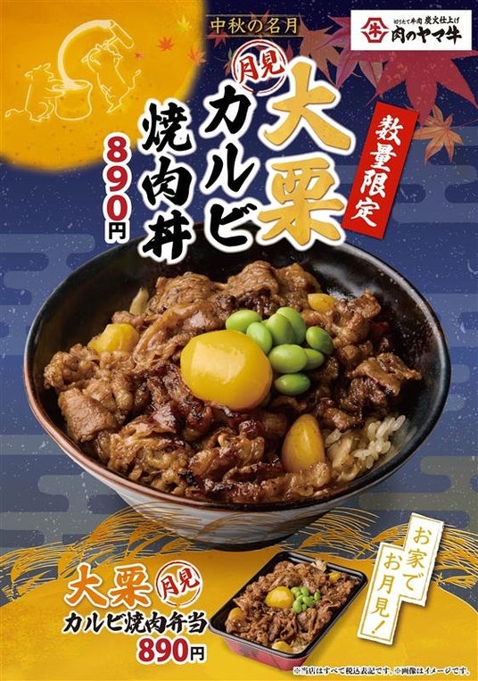 株式会社肉のヤマ牛(本社:東京都渋谷区、代表取締役社長:池ノ上 達也)が展開する、食の感動体験を追求し、切りたて・焼きたてにこだわる炭火仕上げ肉のヤマ牛は、2024年9月17日(火)から22日(日)まで6日間限定で全国の店舗にて月のように丸く、黄金色に輝く大きな栗と切りたて、焼き立ての香ばしい牛カルビをのせた『大栗 月見牛カルビ焼肉丼』の販売を実施いたします。