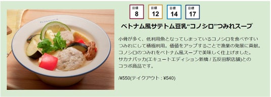 「PLUSOUPLE エキュートエディション御茶ノ水店」では、持続可能な漁業を支えるために、普段は飼料や肥料に使われる低利用魚“コノシロ”を積極的に使用し、魚価向上を目指した「ベトナム風サテトム豆乳“コノシロ”つみれスープ」、スライス加工の過程で発生、処分されるソーセージ、ベーコン、サラミの切れ端部分を使用し、食品廃棄削減に貢献する「常陸野ソーセージ&ベーコンのタルティーヌ」など、サステナブルな限定メニューを多数ご用意しました。おいしく食べて未来へ貢献できるキャンペーンを、ぜひお楽しみください。