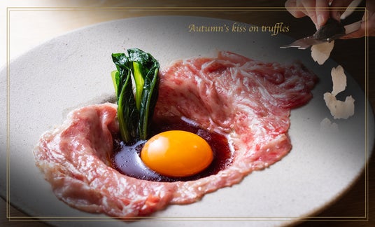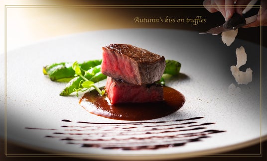 味覚の秋、豊かな季節の薫りを纏ったトリュフが、シェフの手によって丁寧に削られ、黒毛和牛の上に優雅に舞い降りる瞬間。その芳醇な香りと共に、黒毛和牛の柔らかな食感とトリュフの芳香が絶妙に調和し、五感を満たす至高のひとときが広がります。