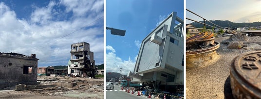 2024年8月の様子(輪島市内)左:公費解体が進んだ朝市周辺 中:解体待ちの建物の一例 右:下水管が飛び出た道路