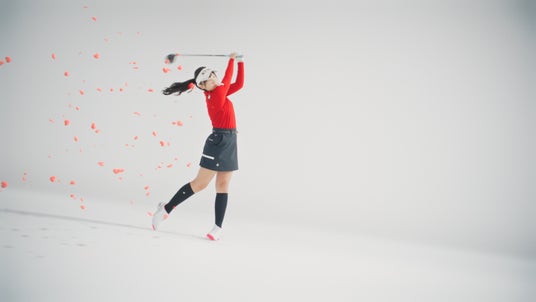 A1.まず、とても楽しかったです。綺麗な衣装を着てスイングできたので、とても新鮮でした。普段はゴルフウェアなんですが、今回は綺麗な赤色のドレスを着てスイングしているので、その新鮮さが見どころかなと思います。