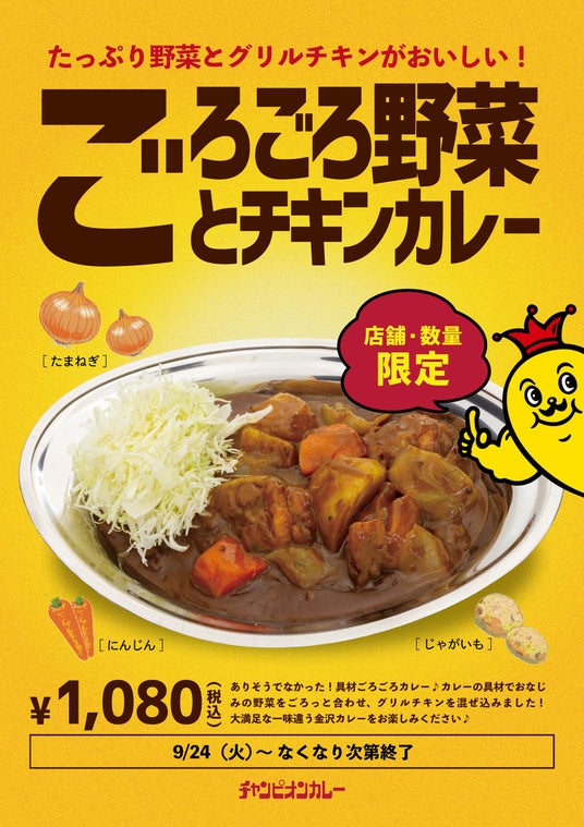 株式会社チャンピオンカレー(本社:石川県野々市市、代表取締役:南 恵太)は、2024年9月24日(火)より、限定メニュー「ごろごろ野菜とチキンカレー」を販売いたします。具材が煮溶けている濃厚な金沢カレーの上にさらにごろっと野菜とグリルチキンを乗せました!なんだかほっと落ち着くようなカレーをぜひお楽しみください。