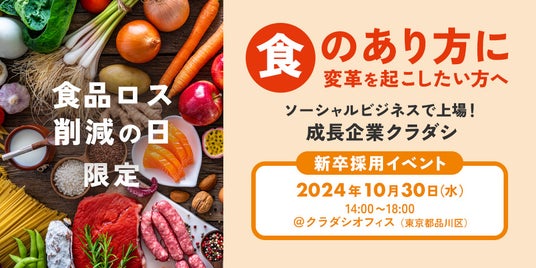 ソーシャルグッドマーケット「Kuradashi」を運営する株式会社クラダシ(本社:東京都品川区、代表取締役社長CEO:河村晃平、以下「クラダシ」)は、「食品ロス削減の日」限定 25新卒採用イベントを昨年に引き続き今年も開催いたします。
