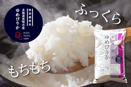 「ゆめぴりか」は、お米の美味しさを凝縮した北海道を代表する良食味米の高級米です。「岸本さんのゆめぴりか」は、豪雪地帯でもある地域の特性を生かして、ミネラル豊富な山の雪解け水を贅沢に使用し、岸本さんが1年間手塩にかけて大切に栽培しました。もちもちとした粘り気のある食感で甘みのあるお米が特徴です。