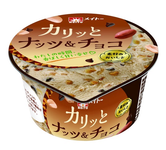アイスの中だけでなくアイスの上にもピーナッツをトッピング。 蓋を開けた瞬間からピーナッツの香ばしい香りが広がります。 さらに、食感の決め手として「チョコ粒」を配合しました。 カリカリの食感がついつい癖になります。ナッツの味わいを楽しめるよう配合したヘーゼルナッツペーストは、チョコ粒との相性も抜群です。
