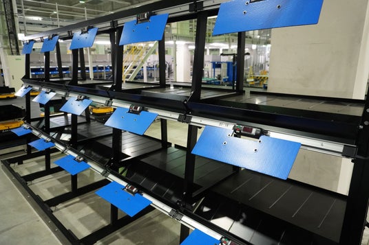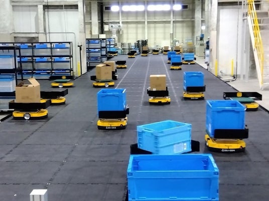 仕分け作業の効率化を図るため、商品を複数の小型AGV(無人搬送車)で搬送する自動出荷システム「T-Carry system」と、「シャッターアソートシステム」を導入しました。小型AGVが作業者の元に商品を運び、作業者は出荷に必要な数量を「シャッターアソートシステム」に入れるため、繊細な商品の仕分け作業が可能になりました。同時に180店舗分の仕分け作業を行うことが可能で、40台以上のAGVが9,000個の商品をステーション(=シャッターアソートステム)に運びます。