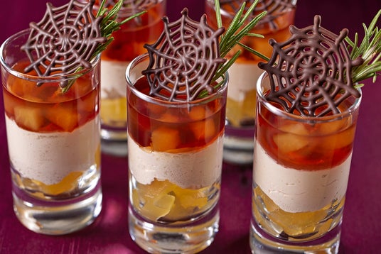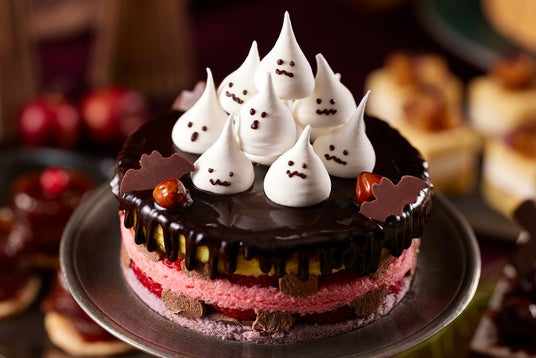 ブッフェテーブルには、身を寄せ合うメレンゲおばけたちがキュートな「ハロウィーンネイキッドチョコレートケーキ」や、キャラメルムースを覆うブルーグリーンのジュレとリンゴチョコが魅惑的な「魔女のリンゴケーキ」、魔法使いに扮したジャック・オー・ランタンが笑いかける「カボチャキャラメルバターサンド」など、約25種類の妖しくも可愛いスイーツが勢ぞろい。