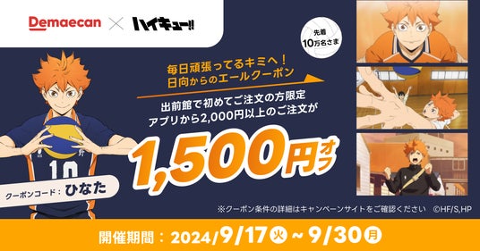 株式会社出前館が運営する日本最大級のデリバリーサービス『出前館』は、アニメ「ハイキュー!!」とのコラボキャンペーン「“食”よ届け いざ頂へ」の第2弾を、2024年9月17日(火)から30日(月)まで開催いたします。第2弾では、出前館でご利用いただけるクーポンの配布に加え、ハイキュー!!の名セリフが描かれたオリジナルタオルが当たるエントリーキャンペーンを実施いたします。ぜひ、この機会に出前館をお楽しみください!