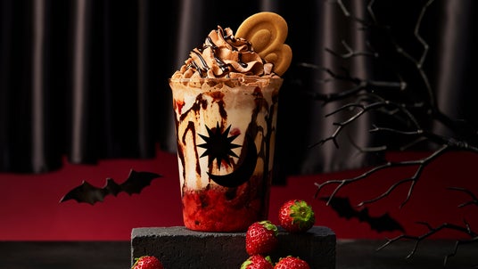 真っ赤なつぶつぶ食感のいちごソースと、カップに飾られたチョコレートソースが恐ろしさを演出する、見た目と反して甘すぎない大人な味わいのハロウィンドリンクです。カカオの香りが楽しめるチョコホイップをトッピングしました。よく混ぜながらお召し上がりください。